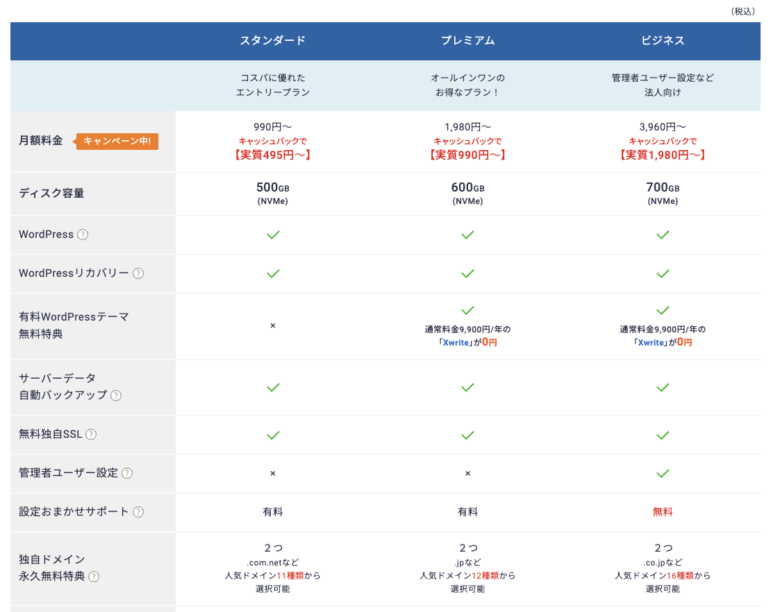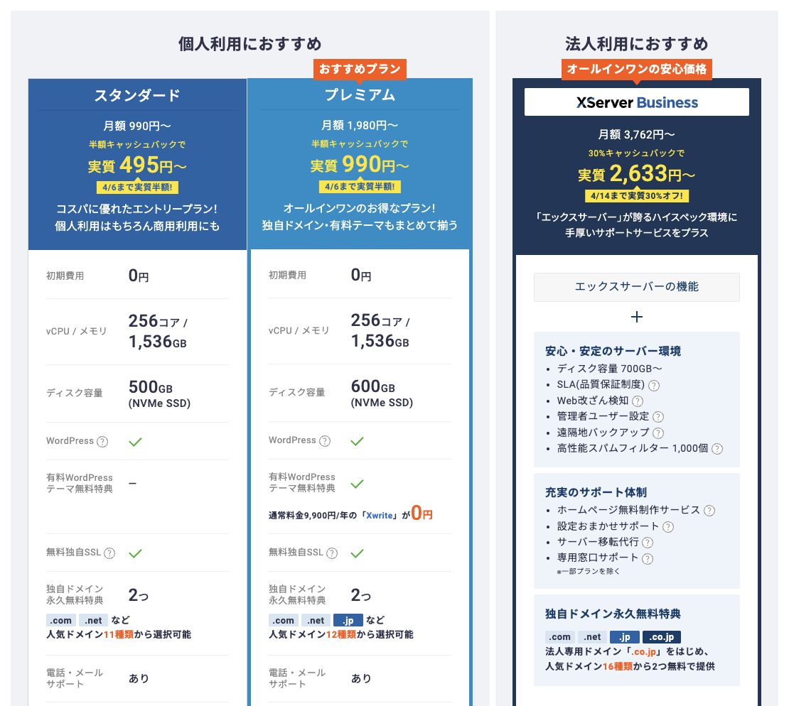 エックスサーバーには「スタンダード・プレミアム・ビジネス」という3種類のプランがあります。