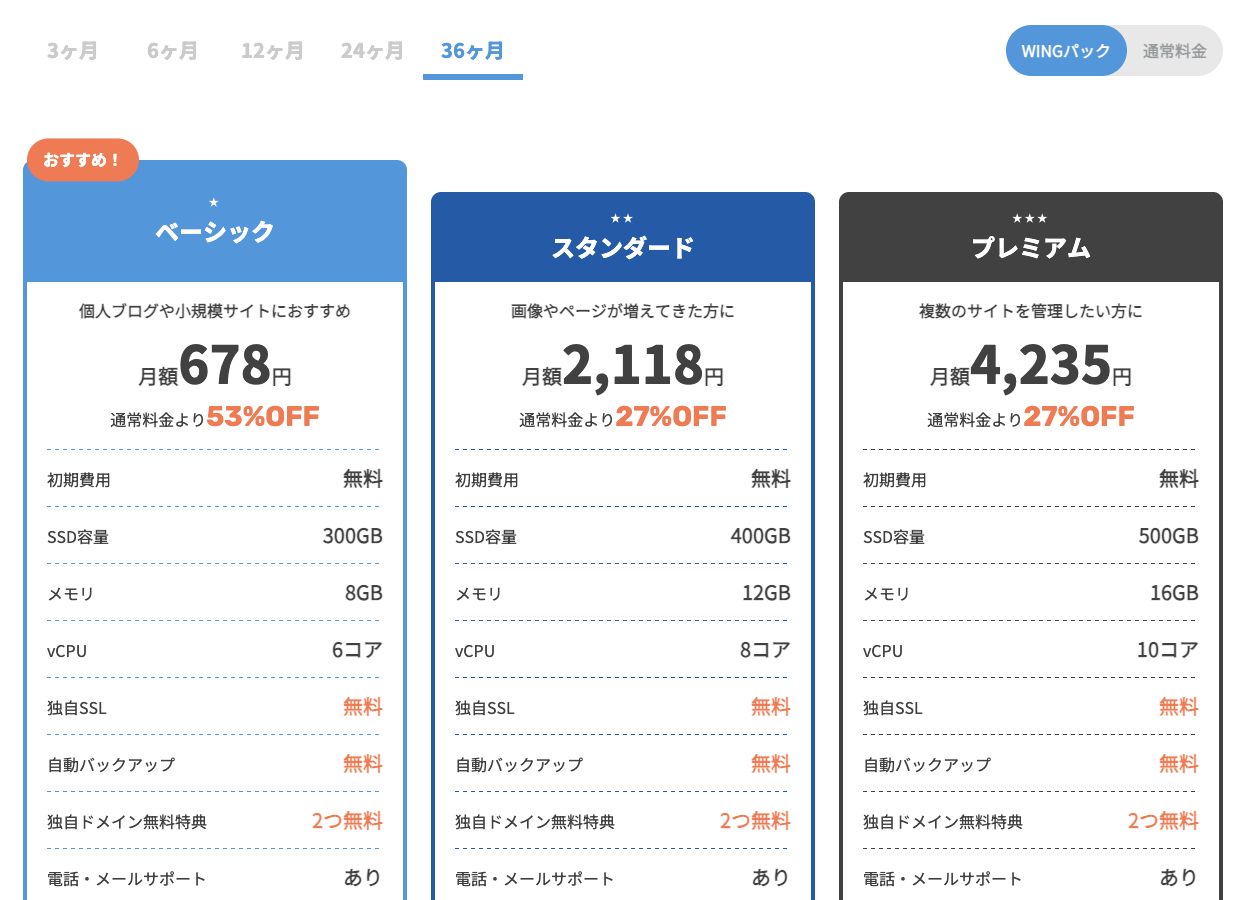 「WINGパック」はレンタルサーバーと独自ドメインがセットになった、長期利用割引プランです。